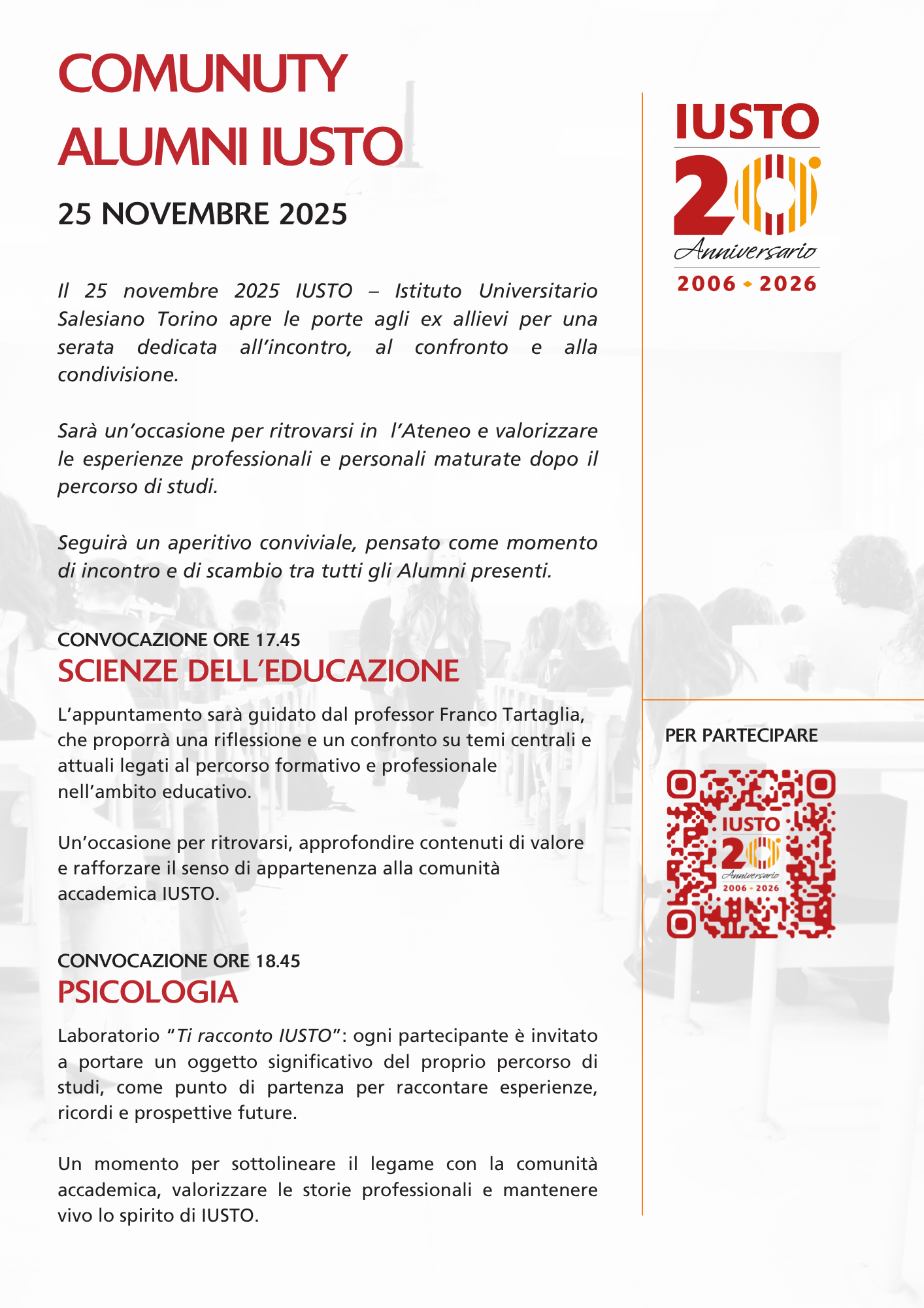 Il 25 novembre 2025 IUSTO apre le porte agli ex allievi per una serata dedicata all’incontro, al confronto e alla condivisione.