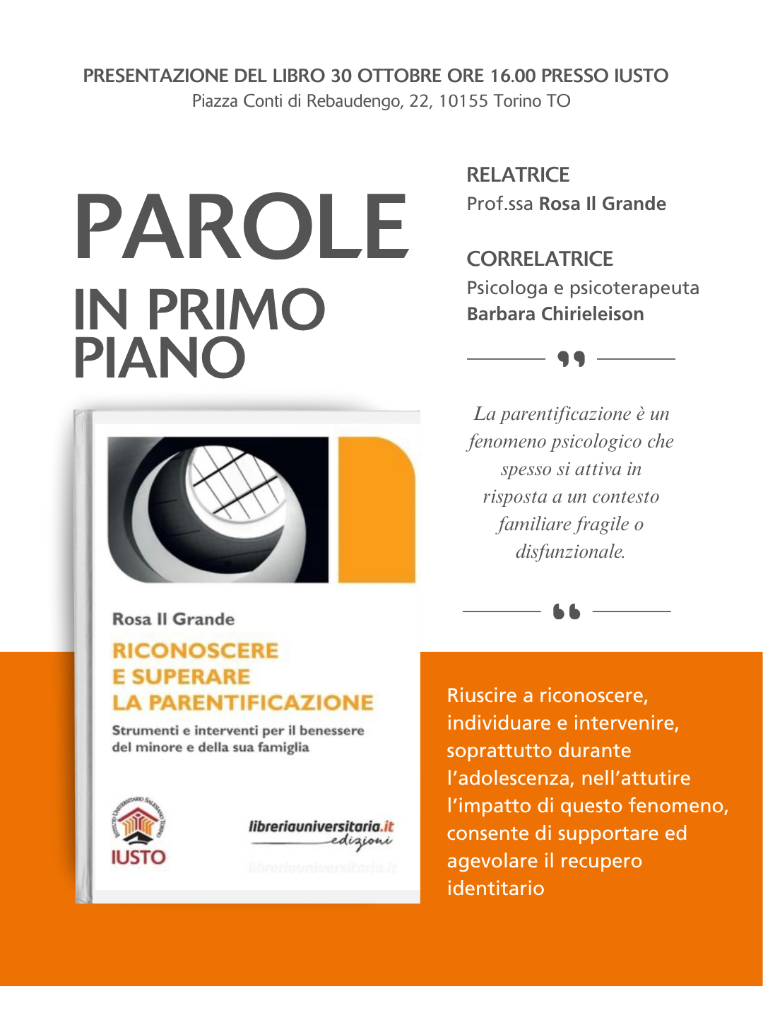 La Prof.ssa Rosa Il Grande, psicologa e psicoterapeuta presso lo IUSTO di Torino, integra pratica clinica, ricerca e formazione, con un focus su relazioni e benessere psico-sociale.